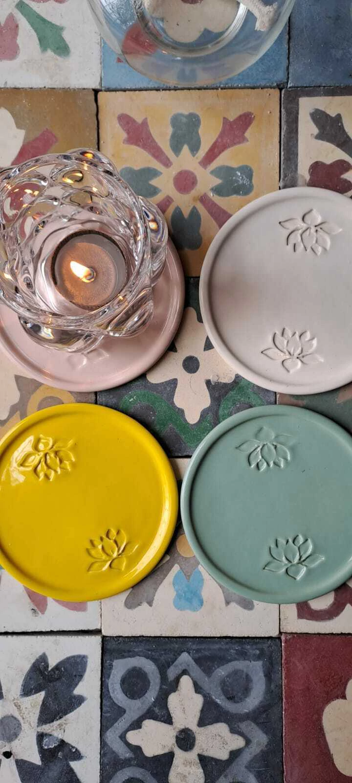Platitos "Z A R A" son piezas únicas elaboradas en arcilla de alta calidad, cocidas a más de 1100 grados para garantizar su resistencia y durabilidad. Cada platito está esmaltado en colores divertidos y decorado con dos delicadas flores de loto impresas, que aportan un toque de elegancia y armonía, ideal para cualquier ambiente de tu hogar o lugar de trabajo.