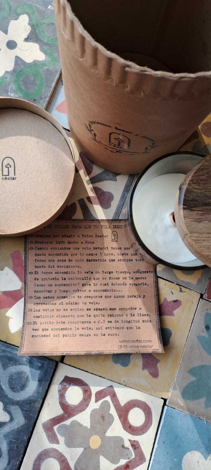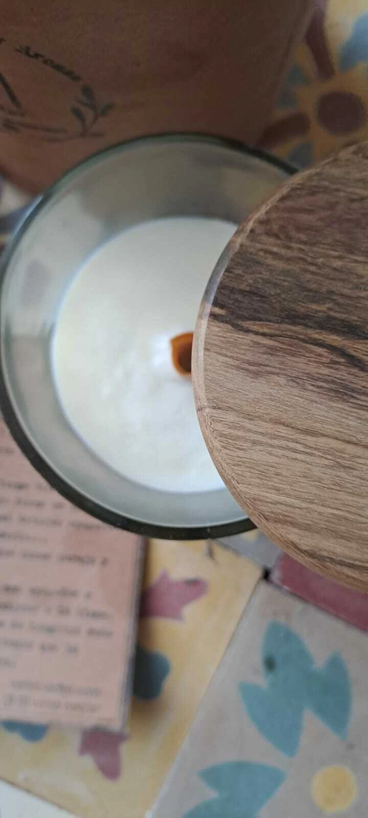 VELA DE CERA DE SOJA EN ENVASE DE VIDRIO. 1 MECHA DE MADERA REDONDA. TAPA DE MADERA DE GUAYUBIRA-
